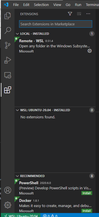 그리고, Remote - WSL 확장을 VS Code에 설치합니다.